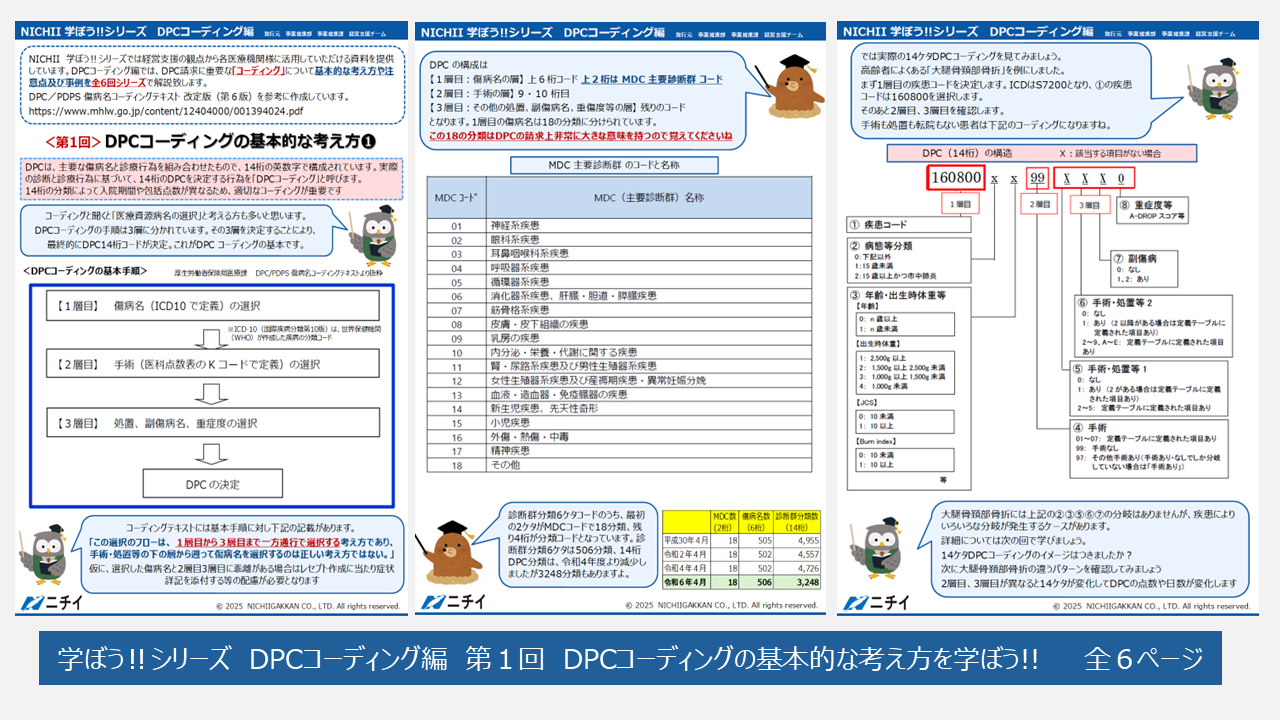 - 学ぼう‼シリーズ DPCコーディング編では『DPC/PDPS 傷病名コーディングテキスト』を参考に、全6回シリーズでDPCコーディングの基本的な考え方やコーディング事例を解説致します。