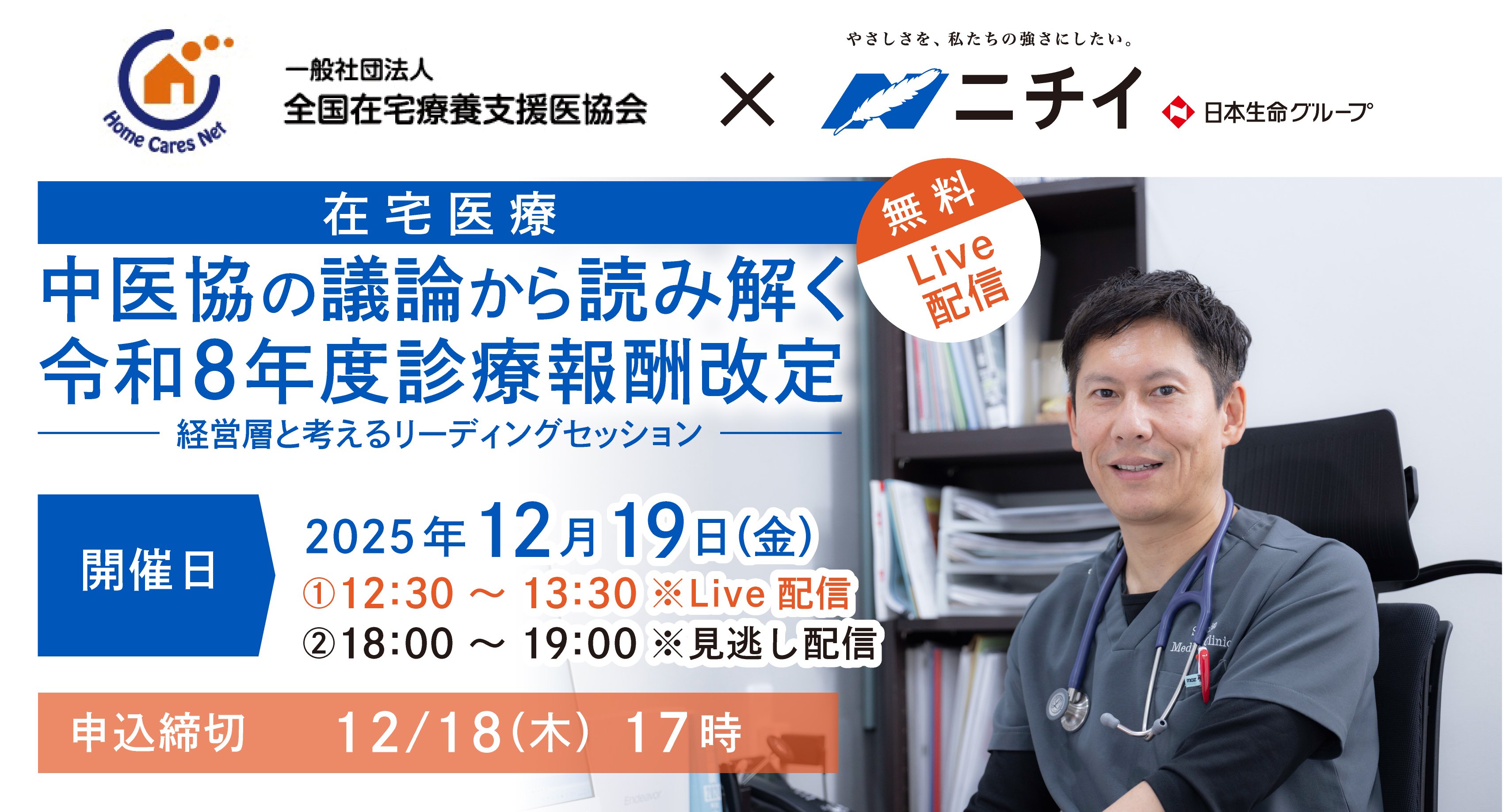 在宅医療における令和8年度(2026年度)診療報酬改定の中医協の動向について、「一般社団法人全国在宅療養支援医協会」と共同でセミナーを開催いたします。現在までの在宅医療領域に関する中医協議論の動向を整理し、今後の自院への活かし方をLive配信で議論いたします。